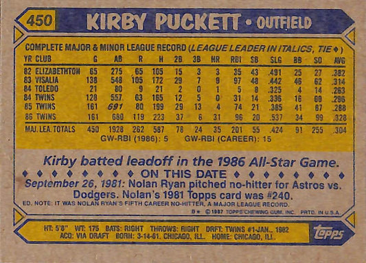 1987 Topps Kirby Puckett MLB Vintage Baseball Double Error Card #450 - Double Error Card - Mint Condition