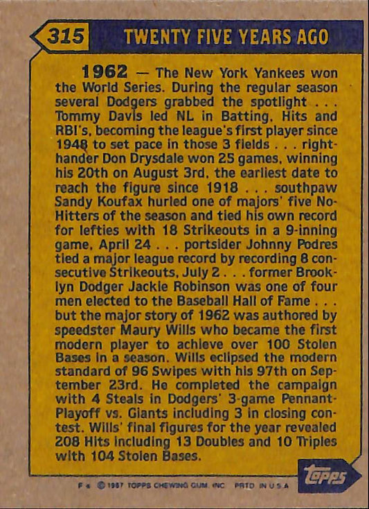 1987 Topps Maury Wills Turn Back The Clock Baseball Card #315 - Mint Condition