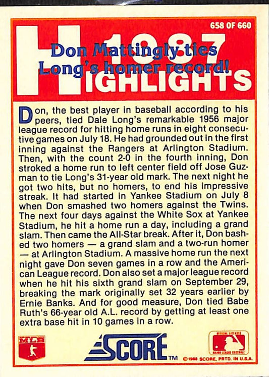 1988 Score Don Mattingly 1987 Highlights MLB Baseball Card #658 - Mint Condition