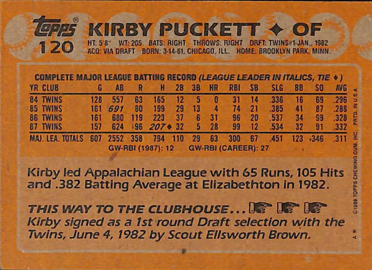 1988 Topps Kirby Puckett MLB Baseball Error Card #120 - Error Card - Mint Condition