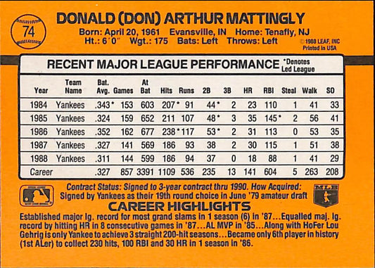 1989 Donruss Don Mattingly Baseball Error Card #74 - Error Card - Mint Condition