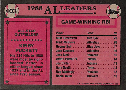 1989 Topps All-Star Kirby Puckett MLB Baseball Card #403 - Mint Condition