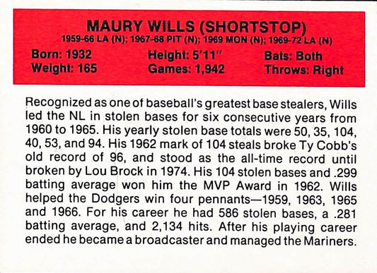 Maury Wills All Time Greats MLB Brooklyn Dodgers Vintage Player Card - Mint Condition
