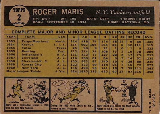 1961 Topps Roger Maris Vintage Baseball Card Yankees #2 - Error Miss Cut Card - Mint Condition