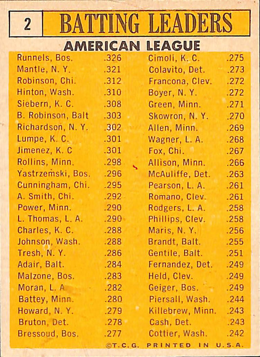 1963 Topps Mickey Mantle - AL- Batting Leaders Baseball Card #2 - Near Mint Condition