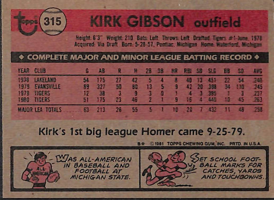 1981 Topps Kirk Gibson Rookie MLB Baseball Card #315 - Rookie Card- Mint Condition