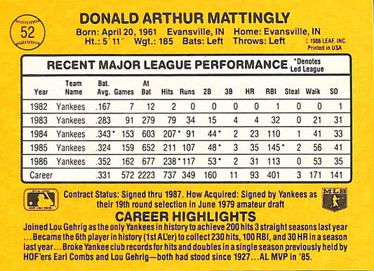 1987 Donruss Don Mattingly Baseball Card #52 - Mint Condition