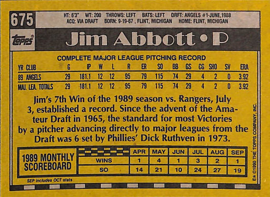 1990 Topps Jim Abbott Vintage Baseball Rookie Card #675 - Rookie Card - Mint Condition