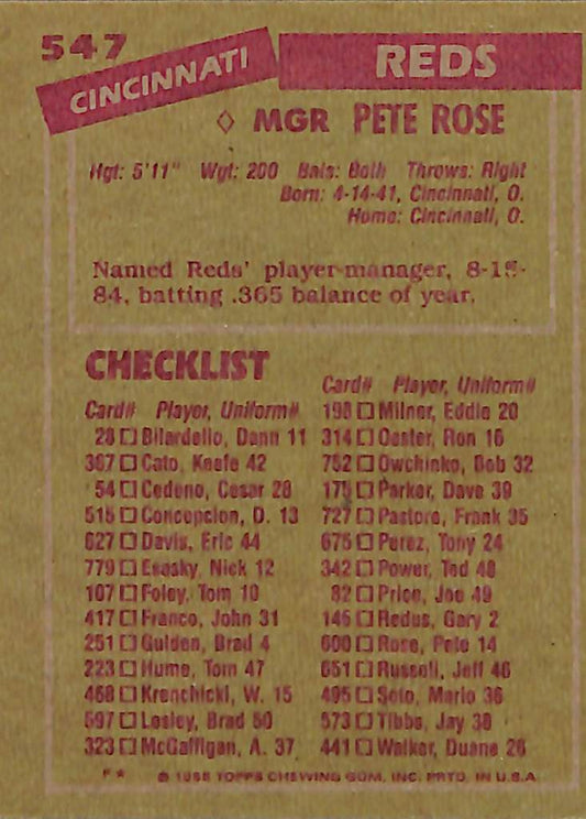 1985 Topps Vintage Pete Rose Baseball Card #547 - Mint Condition - Error Cut Odd