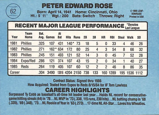 1986 Donruss Pete Rose Manager Vintage Baseball Card #62 - Mint Condition