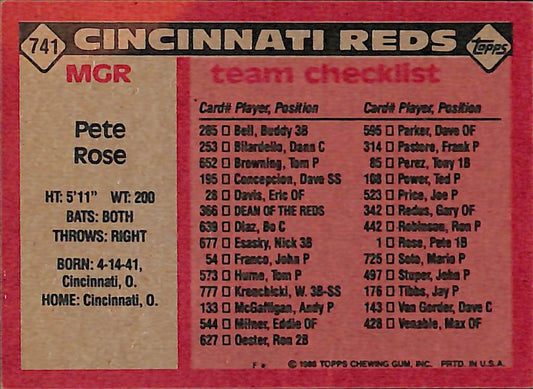 1986 Topps Pete Rose Vintage Baseball Card #741 - Mint Condition