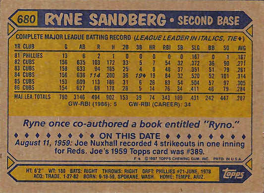 1987 Ryne Sandberg Baseball Card #680 - Mint Condition