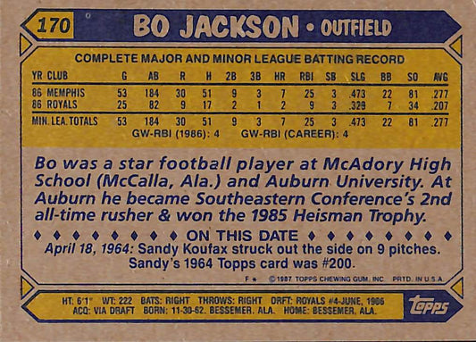 1987 Topps Bo Jackson Rookie Card Vintage Baseball Card #170 - Rookie Card - Mint Condition