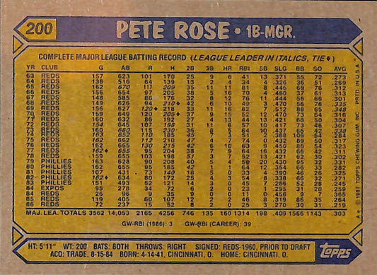 1987 Topps Pete Rose Vintage Baseball Card #200 - Mint Condition