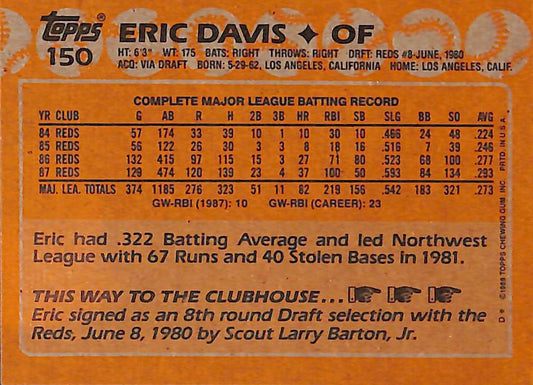 1988 Topps Eric Davis Vintage MLB Baseball Card #150 - Mint Condition
