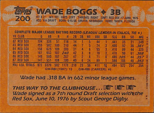 1988 Topps Wade Boggs Baseball Card #200 - Mint Condition
