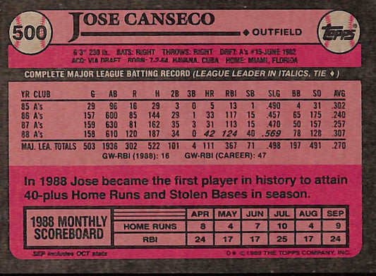 1989 Topps Jose Canseco Baseball Error Card #500 - Mint Condition Error Card