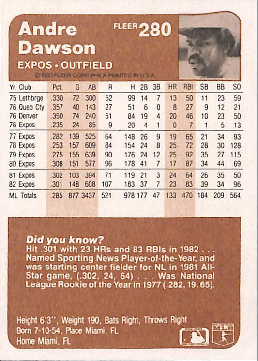 1983 Fleer Andre Dawson Vintage Baseball Card #280 - Mint Condition