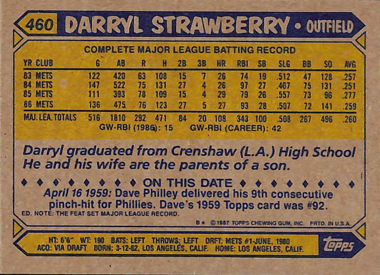 1987 Topps Vintage Darryl Strawberry MLB Baseball Card #460 - Mint Condition