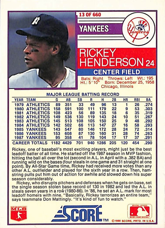 1988 Score Rickey Henderson Vintage Baseball Card #13 - Mint Condition