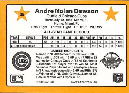 1989 Donruss All Stars Andre Dawson Vintage Baseball Card #36 - Mint Condition