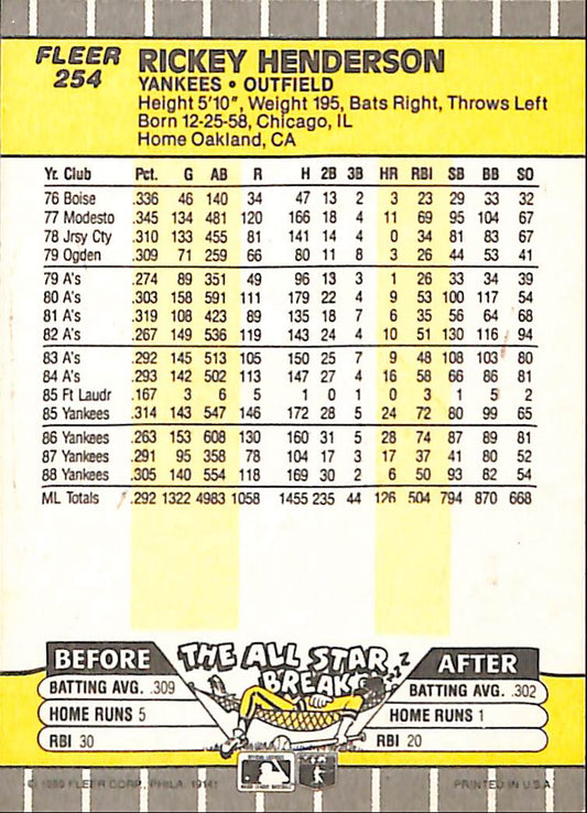 1989 Fleer Rickey Henderson Vintage Baseball Card #254 - Mint Condition