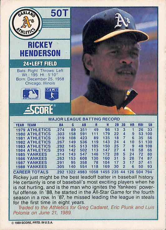 1989 Score Rickey Henderson Vintage Baseball Card #50T - Mint Condition
