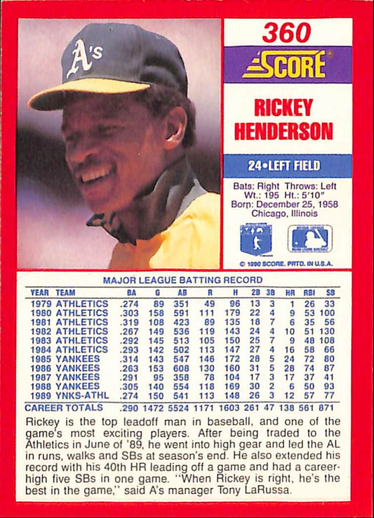 1990 Score Rickey Henderson Vintage Baseball Card #360 - Mint Condition