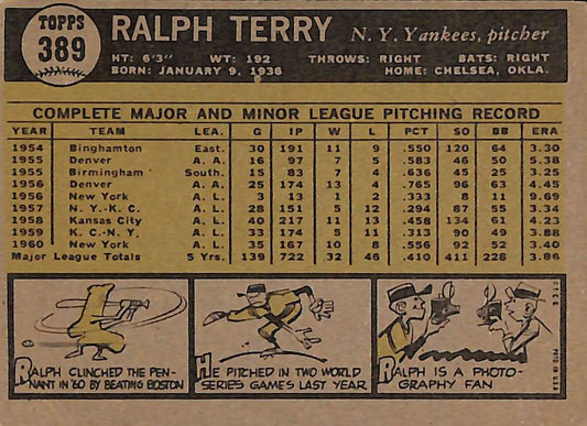 1961 Topps Ralph Terry Vintage Baseball Card #389 - Mint Condition