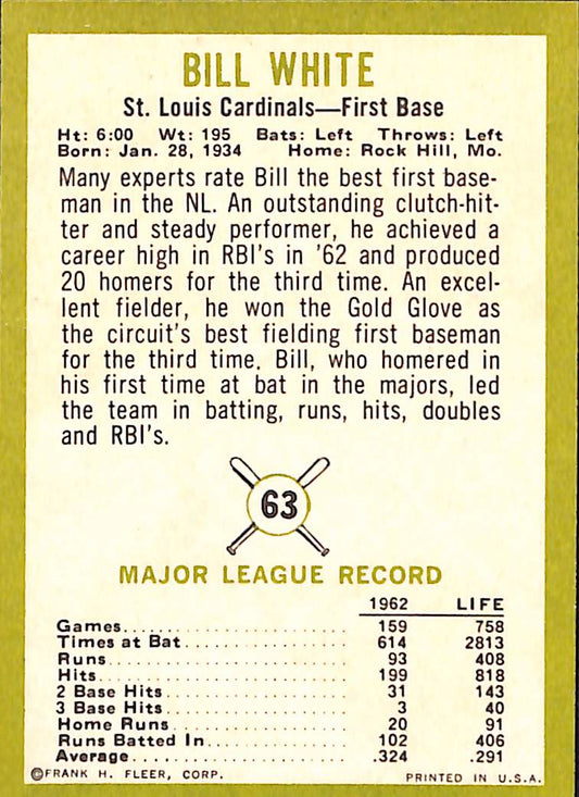 1963 Fleer Bill White Vintage Baseball Card #63 - Mint Condition