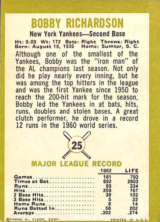 1963 Fleer Bobby Richardson Vintage Baseball Card #25 - Mint Condition