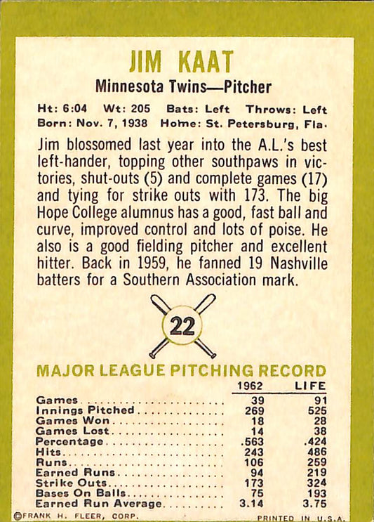1963 Fleer Jim Kaat Vintage Baseball Card #22 - Mint Condition