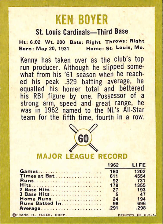 1963 Fleer Ken Boyer Vintage Baseball Card #60 - Mint Condition
