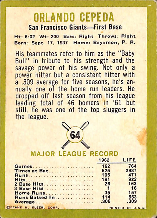 1963 Fleer Orlando Cepeda Vintage Baseball Card #64 - Good Condition