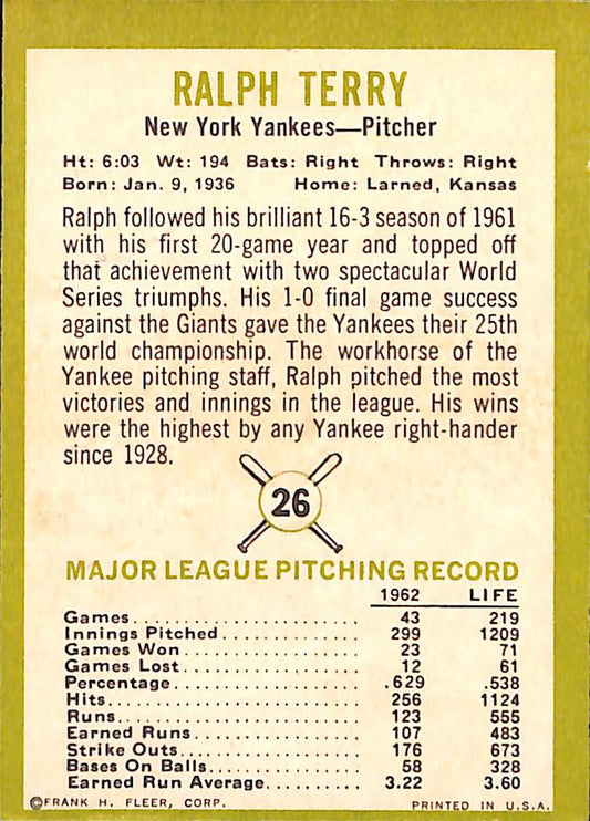 1963 Fleer Ralph Terry Vintage Baseball Card #26 - Mint Condition