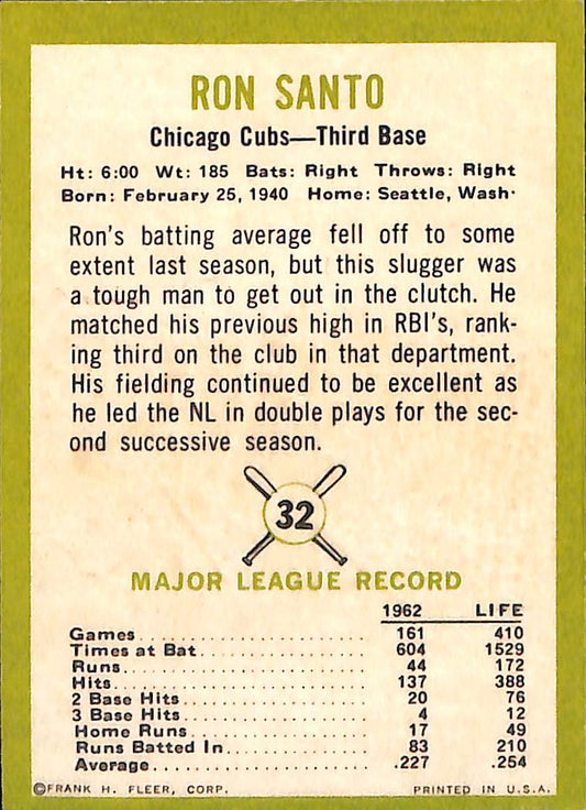1963 Fleer Ron Santo Vintage Baseball Card #32 - Mint Condition