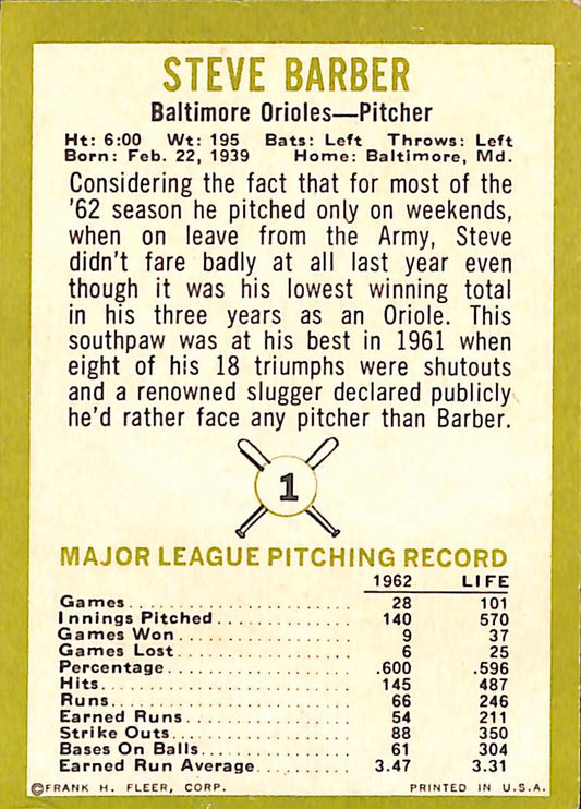 1963 Steve Barber Vintage Baseball Card #1 - Mint Condition