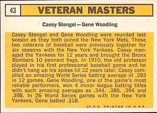 1963 Topps Veteran Masters Casey Stengel - Gene Woodling Vintage Baseball Card #43- Mint Condition