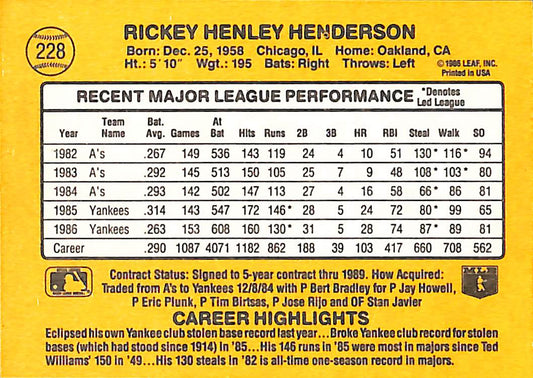 1987 Donruss Rickey Henderson Vintage Baseball Card #228 - Mint Condition