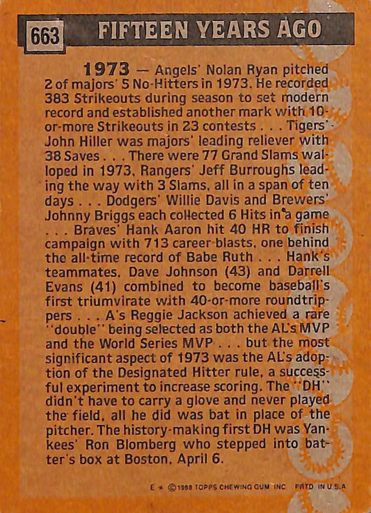 1988 Topps Ron Blomberg Turn Back The Clock Vintage Baseball Card #663 - Mint Condition